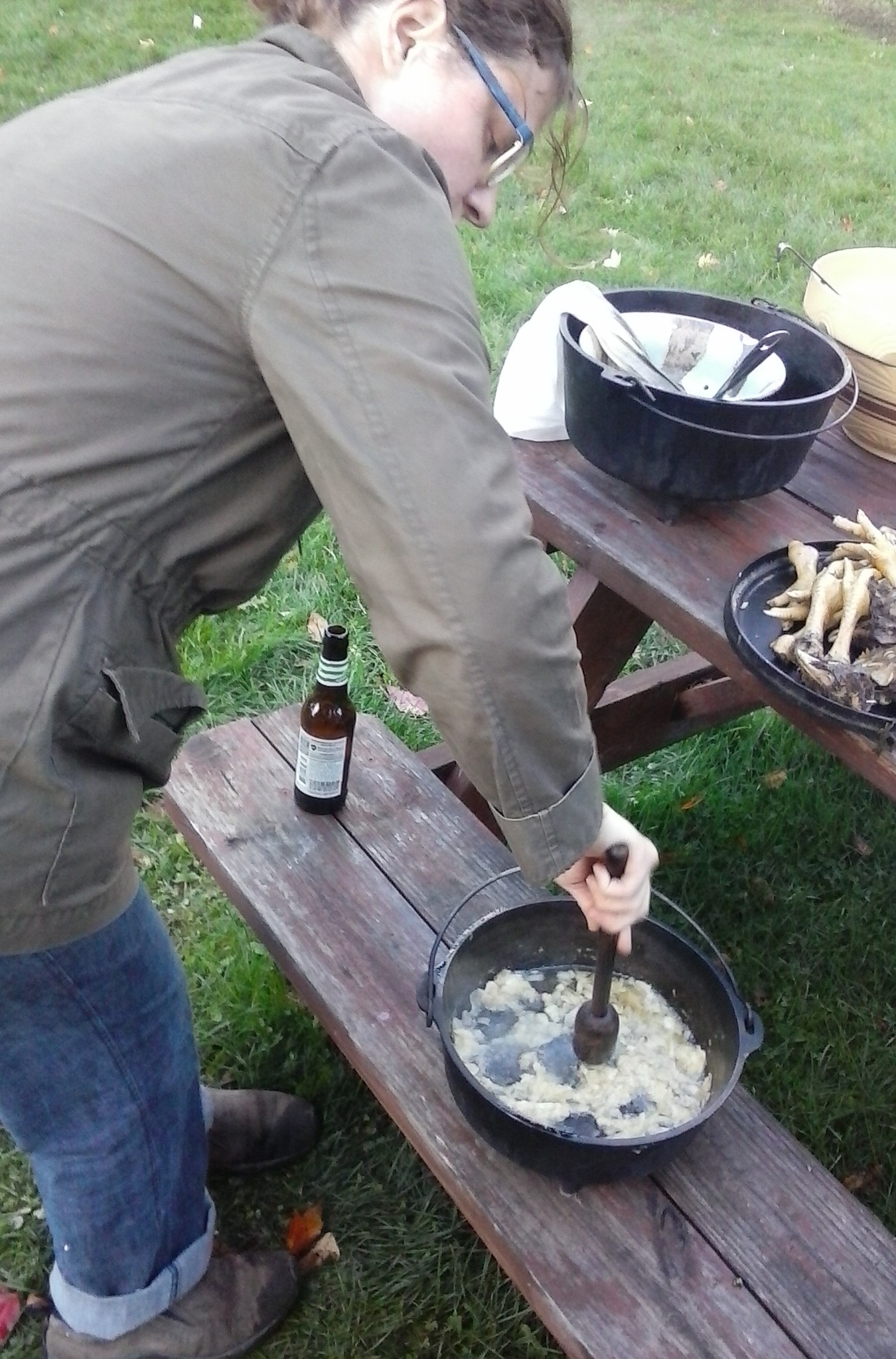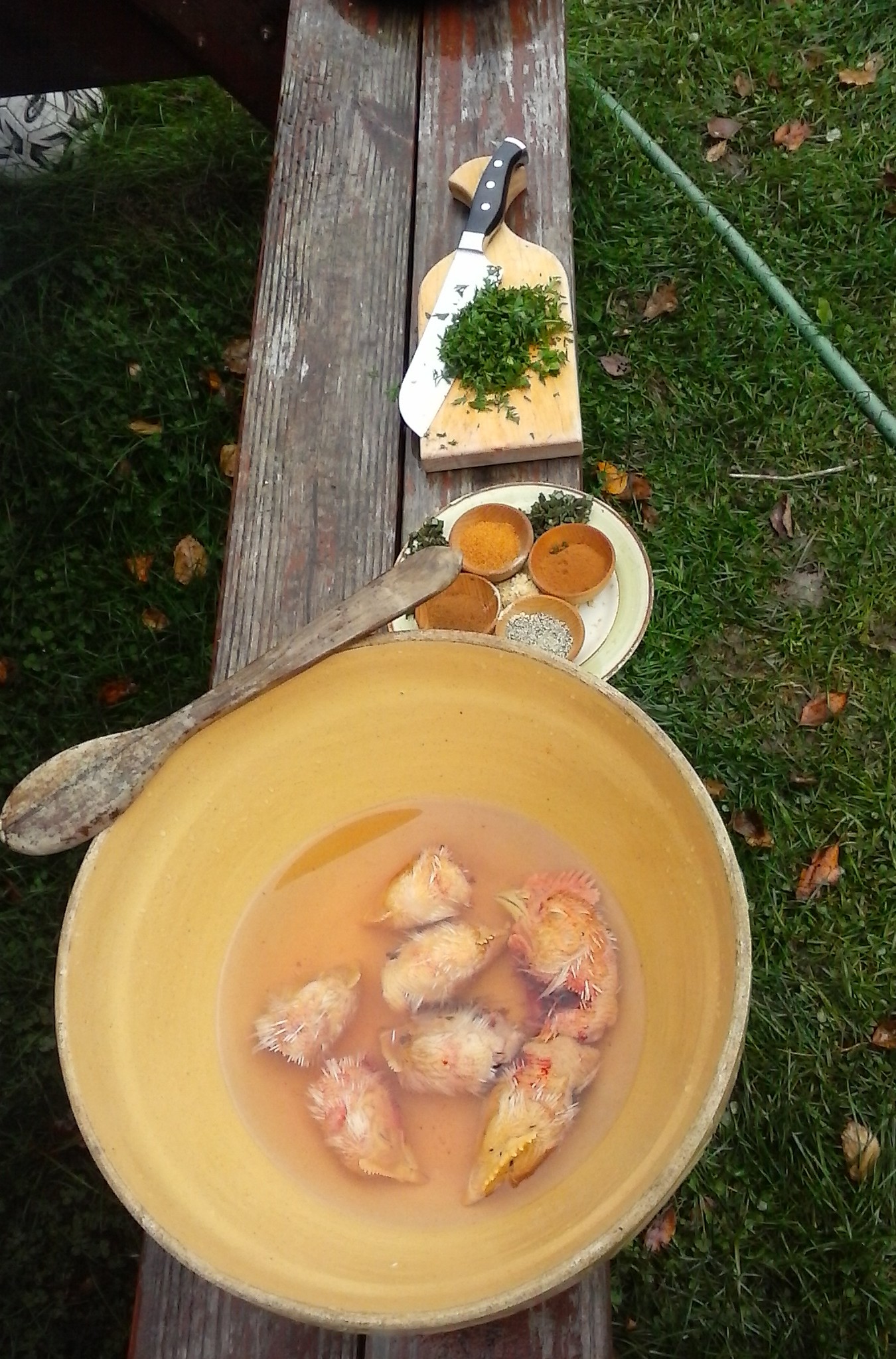 It was the annual chicken harvest at the Packards’ house. A few SCA and non SCA folk gather and harvest the chickens raised over the summer. This year there were 49 chickens. Last week Anya and I made chicken foot stew loosely inspired by the Garbage recipe to make a potluck dish at the Endewearde Hunt. We used last year’s frozen chicken feet. But – behold – it was chicken killing day! There were all KINDS of chickens and ample “garbage” about so we decided to make the recipe today with all the fresh garbage we had.